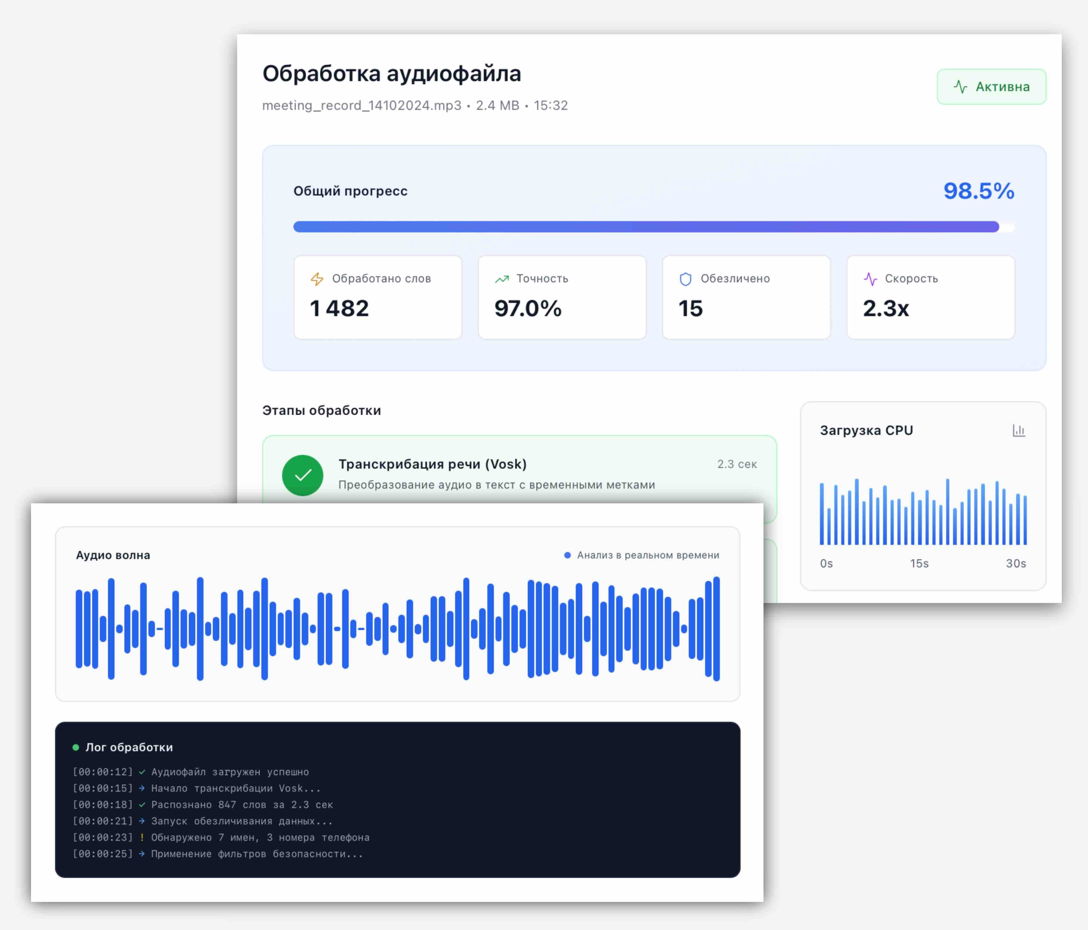Компания - заказчик имела задачу — автоматизировать транскрибацию голосовых сообщений на внутренней инфраструктуре, чтобы соблюсти требования безопасности и конфиденциальности. Важно было не только преобразовывать речь в текст, но и структурировать её, а также обезличивать данные, чтобы минимизировать риски утечек личной информации.